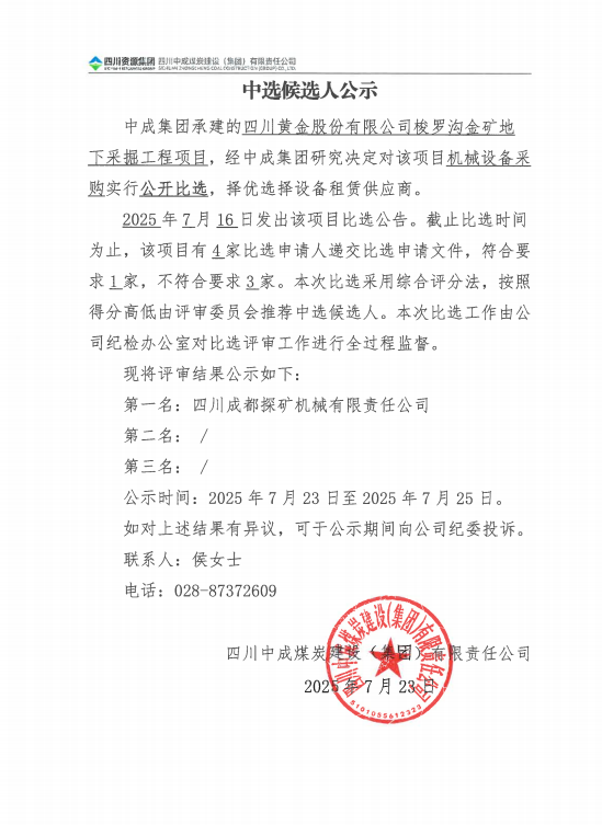 四川黃金股份有限公司梭羅溝金礦地下采掘工程機(jī)械設(shè)備采購(gòu)中選候選人公示