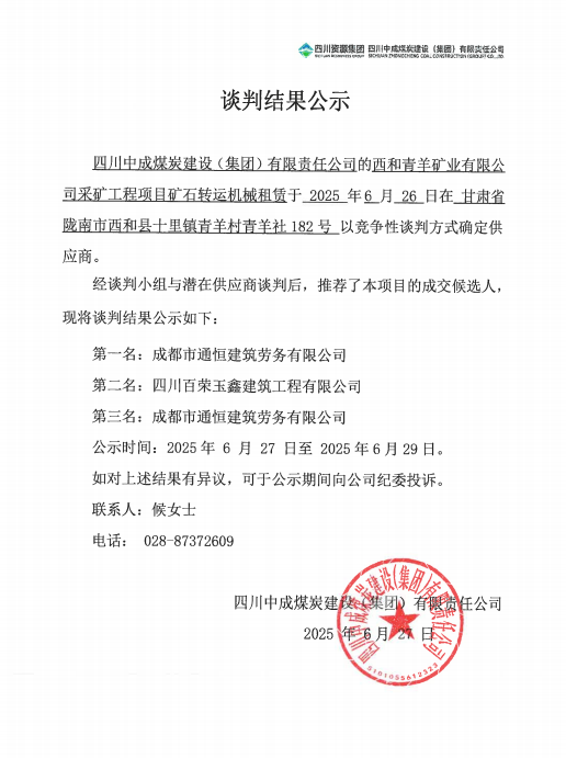 西和青羊礦業(yè)有限責(zé)任公司采礦工程項(xiàng)目地上礦石轉(zhuǎn)運(yùn)機(jī)械租賃談判結(jié)果公示