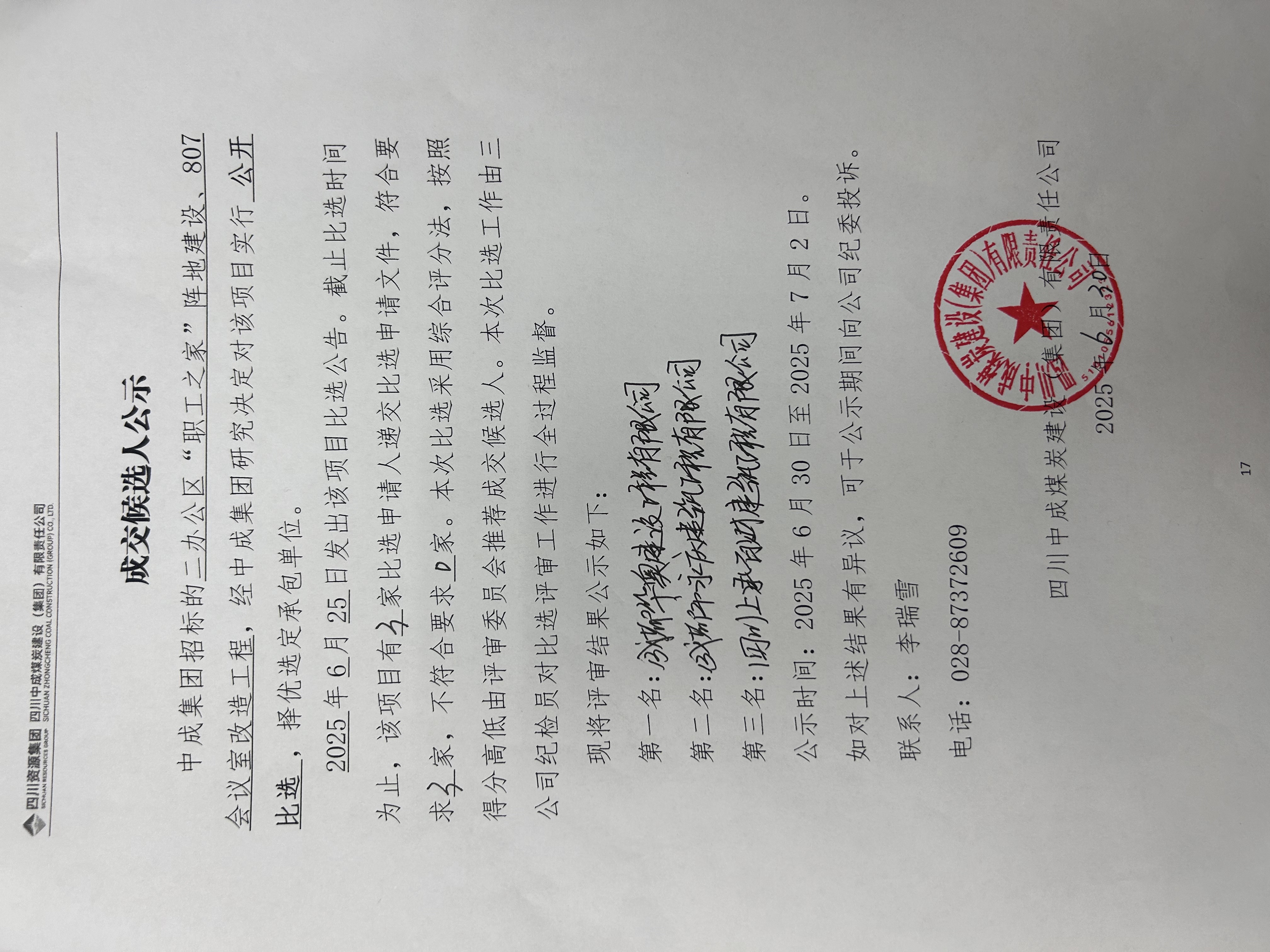 二辦公區(qū)“職工之家”陣地建設(shè)、807會(huì)議室改造工程成交候選人公示
