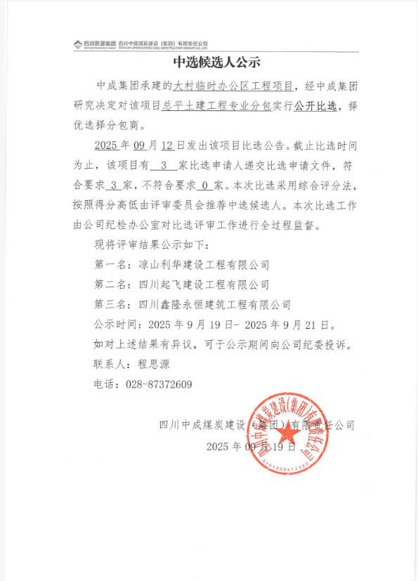 大村臨時辦公區(qū)工程項目總平土建工程專業(yè)分包中選候選人公示