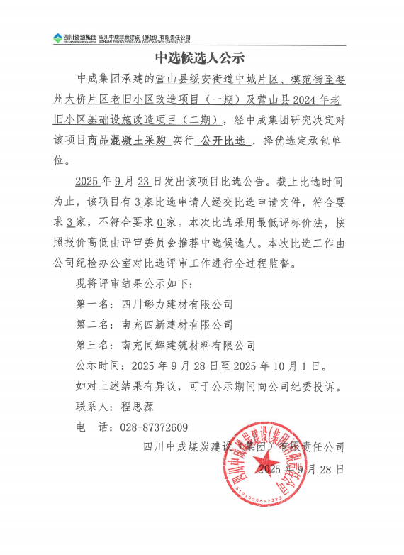 營山縣綏安街道中城片區(qū)、模范街至婺州大橋片區(qū)老舊小區(qū)改造項目(一期)及營山縣2024年老舊小區(qū)基礎設施改造項目(二期)商品混凝土采購中選候選人公示